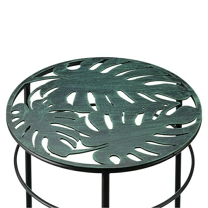 Der Beistelltisch ist mit seinem auffallenden Tischplattenmotiv ein echter Hingucker für jeden Wohnraum und bietet vielerlei Dekorationsmöglichkeiten. Die pulverbeschichtete Tischplatte mit Blattmotiv setzt einen schönen Kontrast, zu den aus Eisen gefertigten, lackierten Tischbeinen. Auch als Dekoobjekt für die Präsentation von Vasen, Blumen und Kunstelementen eignet er sich ideal. Der Beistelltisch ist in verschiedenen Größen erhältlich und kann individuell zusammengestellt werden.