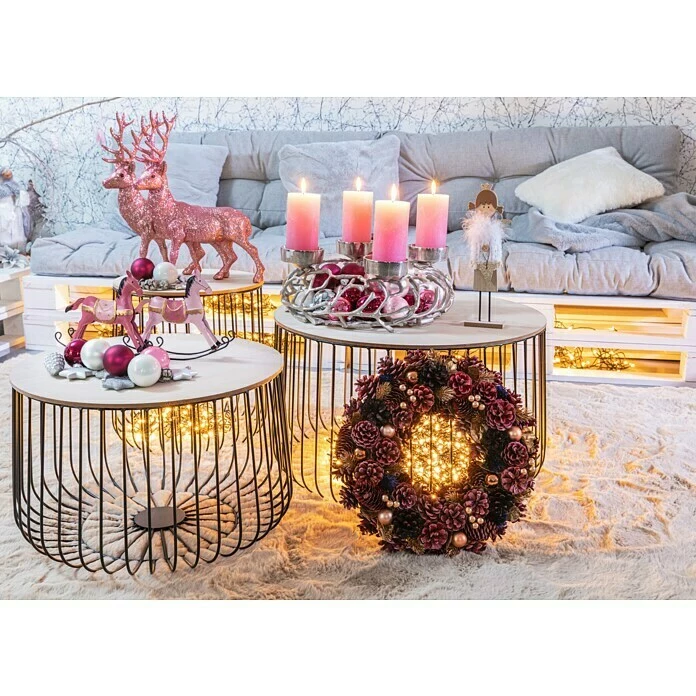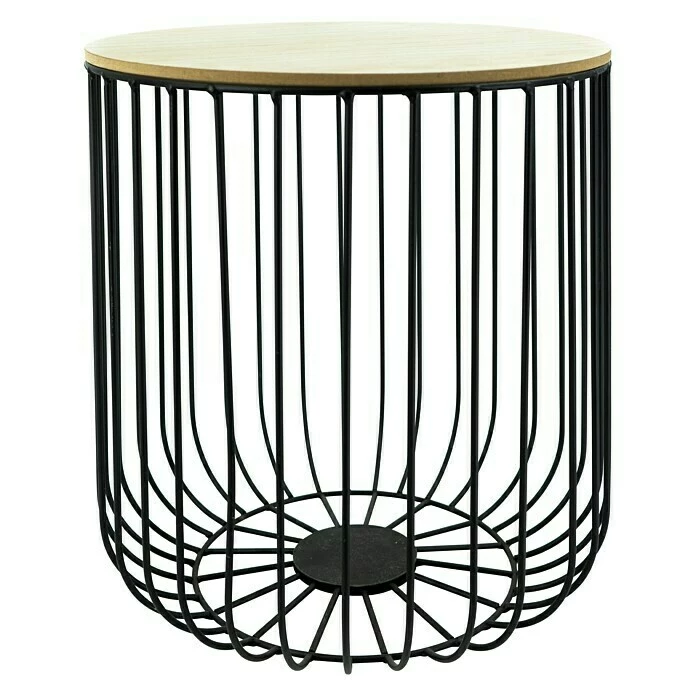 Der Beistelltisch ist in modernem schwarz und einer naturfarbenen Holzplatte ein echter Hingucker in jedem Wohnraum und bietet vielerlei Dekorationsmöglichkeiten. Der Metallkorb-Tisch fügt sich durch sein skandinavisch minimalistisches Design in nahezu jeden Einrichtungsstil hervorragend ein und sorgt für ein gemütliches Wohnambiente. Die Tischplatte setzt einen interessanten Kontrast zu dem aus Metall gearbeiteten Gestell – in Kombination lockert der Tisch den Raum auf und wird zu einem absoluten Eyecatcher.