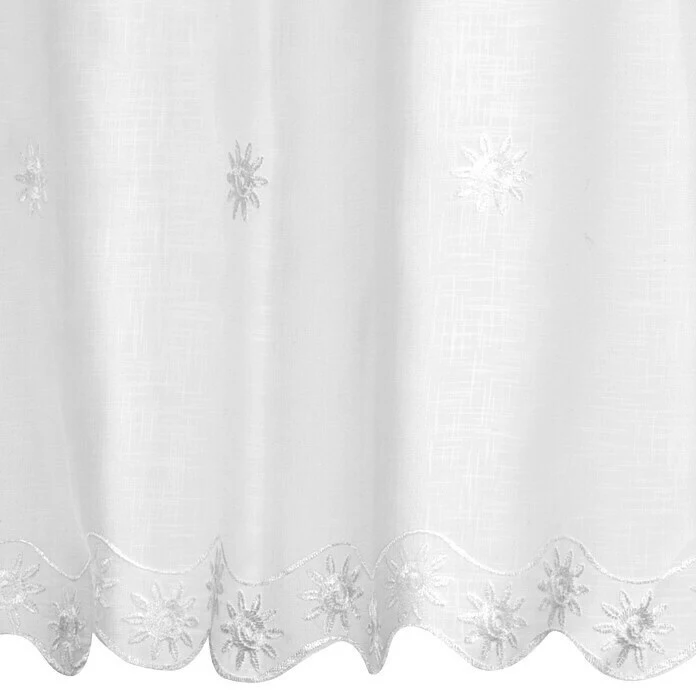 Die Bistrogardine Valley ist ein Struktur-Voile mit floraler Musterung aus Effektgarnen. Der Stoff überzeugt durch den luftigen Fall und die weiche Qualität. Ein optischer Genuss, der sich wunderbar auch für kleine Fenster eignet. Die Bistrogardine, oder auch Cafehausgardine genannt, bietet mit Schlaufenaufhängung – zur Montage mit einem Scheibenspanner – einen leichten Sichtschutz: Der untere Teil des Fensters wird dekoriert und der Blick nach Draußen bleibt bestehen.