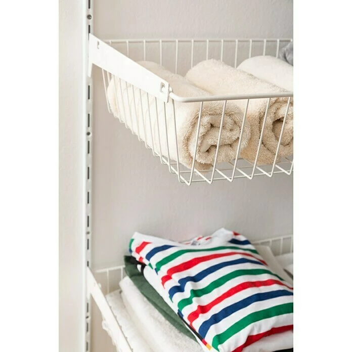 Der Drahtkorb mit Trägern von Element System eignet sich zur Kombination mit Lochschienensystemen und schafft Raum für alle Arten der Vorratshaltung. Die Montage erfolgt durch einfaches Einhängen und kann sowohl mit Schienen CLASSIC 50 als auch im CLASSIC 32 verbaut werden.