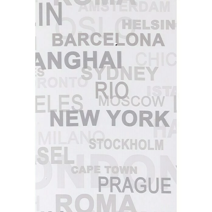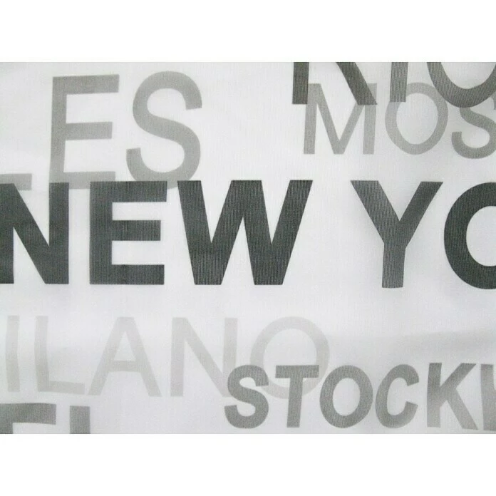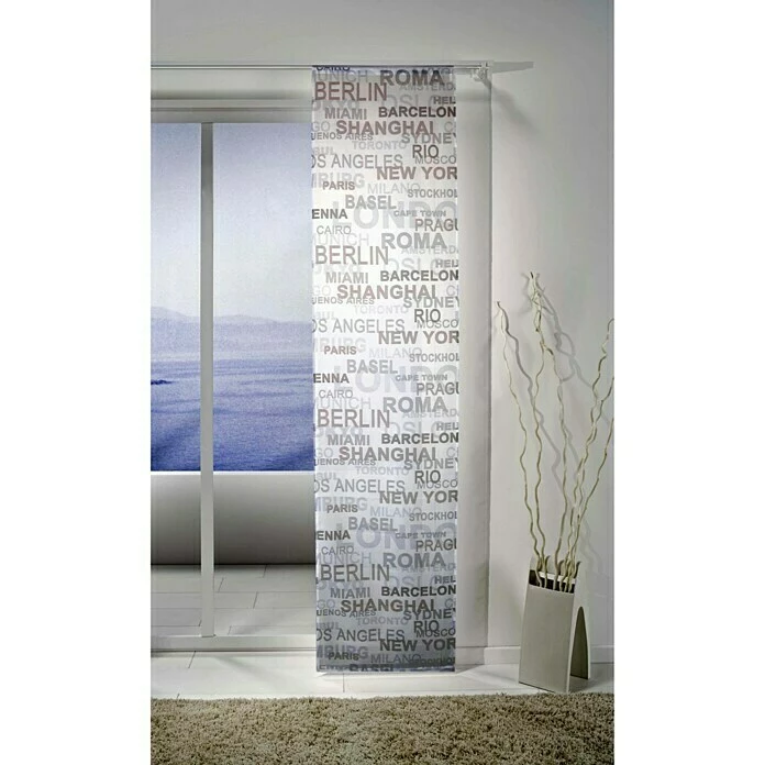 Mit dem Flächenvorhang Town von Expo Ambiente erhält jeder Wohnraum einen modernen Flair. Der transparente Vorhang wurde aus 100 % Polyester gefertigt und überzeugt durch seine weiche, leichte Qualität. Das hochwertig im Digitaldruckverfahren ausgeführte Design aus Städtenamen wertet den Raum optisch auf und lässt sich dabei hervorragend mit Uni-Schiebevorhängen kombinieren. Mithilfe des Klettbands ist der Vorhang im Handumdrehen aufgehängt. Hinweis: Paneelwagen nicht im Lieferumfang enthalten.