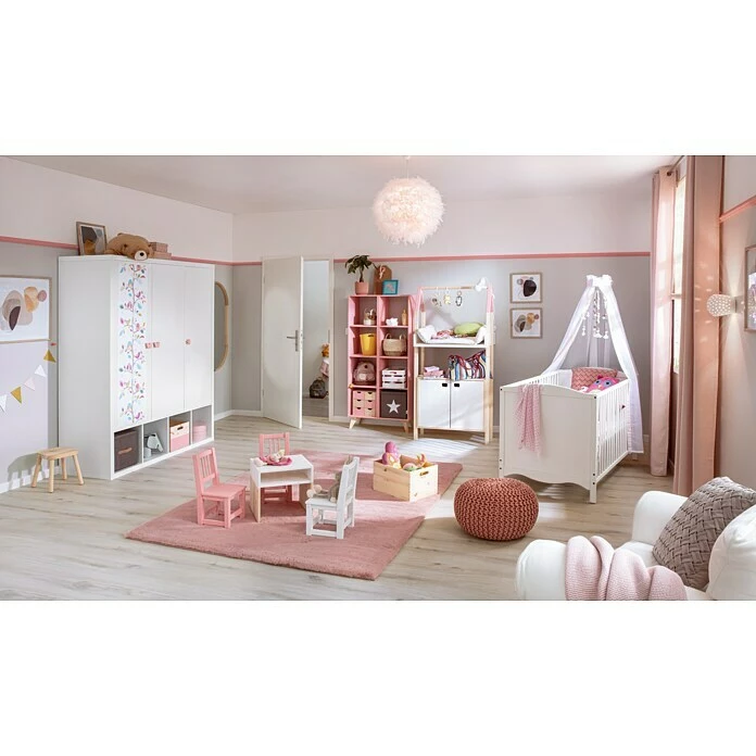 Der Kleiderschrank Caro von Phönix bietet großzügigen Stauraum für Ihre Kleidung oder Schuhe. Der dreitürige Schrank ist mit einer Kleiderstange ausgestattet, die sich über die Breite von zwei Türen erstreckt. Über dieser befindet sich ein geräumiges Fach. Hinter der dritten Tür verbergen sich vier großzügige Fächer, auf denen Sie gefaltete Kleidung unterbringen können. Als besondere Hingucker fungieren die vier Fächer am Fuße des Schrankes, die entweder als offene Fächer verwendet oder durch verschiedene Einsätze wie Schubladencontainer, Türen oder Kisten erweitert werden können.