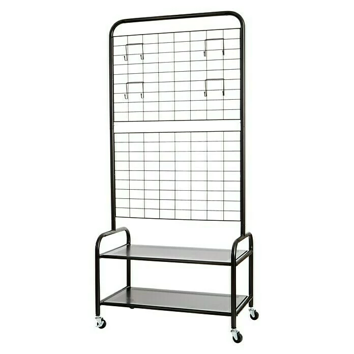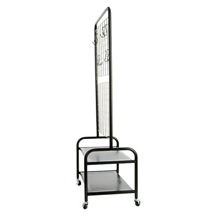Der Kleiderständer Loft von Store It eignet sich zum Verstauen von Jacken, Schuhen und anderen Kleidungsstücken. Der praktische Kleiderwagen ist aus einem stabilen Metallgestell gefertigt in dem ein Gitter eingelassen ist. Mit Hilfe der im Lieferumfang enthaltenen vier Haken lassen sich auch Mützen oder Rucksäcke problemlos verstauen. Auf den beiden Ablageflächen lassen sich Schuhe oder andere Gegenstände ablegen. Der Kleiderständer lässt sich, dank der Rollen, bequem verschieben. Die Belastbarkeit beträgt 30 kg/Stange.